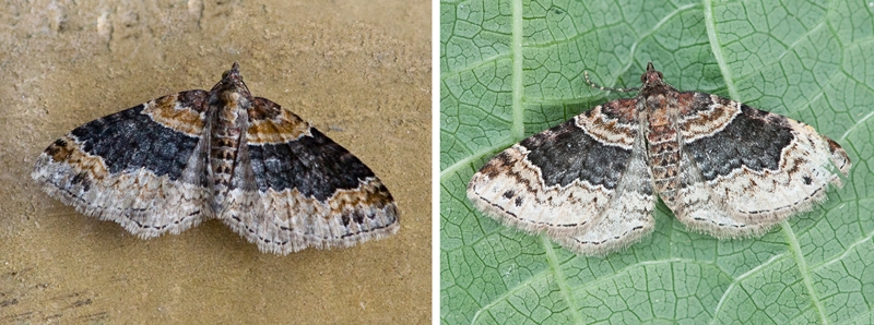 Frequently found in a wide range of habitats during July and August. Quite variable in colour with the main cross-band ranging from blue-grey to dull red. The red forms can easily be confused with red twin-spot carpet (Xanthoroe spadicearia).