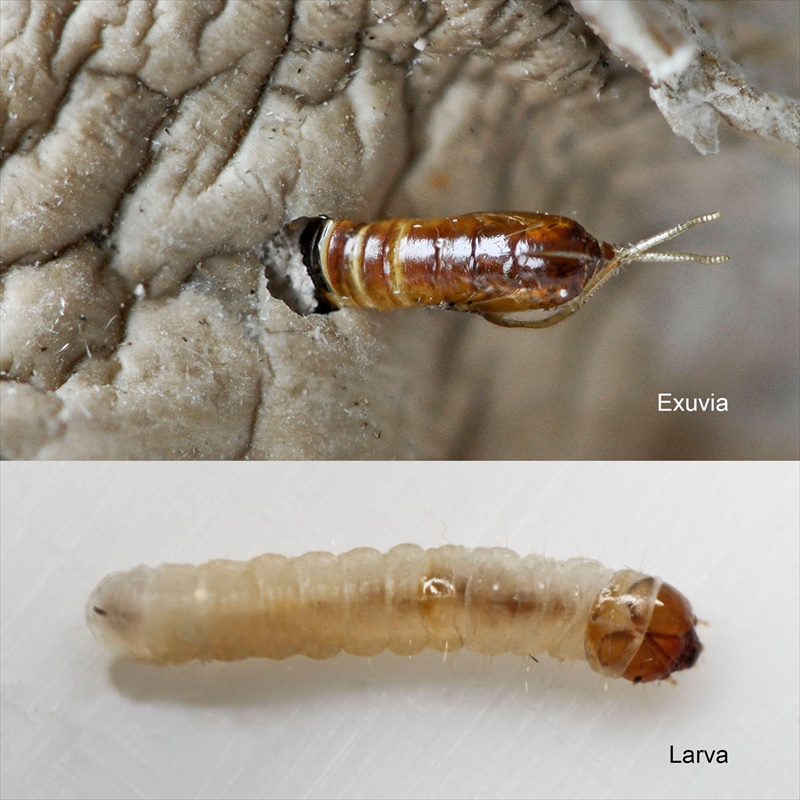 Ardivachar, South Uist, Scotland, 2013. Adults reared from larvae which emerged from a container of "Dried Mixed Forest Mushrooms" (Suillus luteus, Pleurotus ostreatus, Auricula udae, Boletus edulis), packed in France but grown in Far East Asia. Identification Reinhard Gaedike (via Martin Honey), who states: " ... a surprise! The shape fully agrees with the fig. 1 in Robinson (1980) Entomologist's Gazette 31: 129-142: Nemapogon asyntacta (Meyrick, 1917), hitherto known from India (locus typicus) and from Tibet.