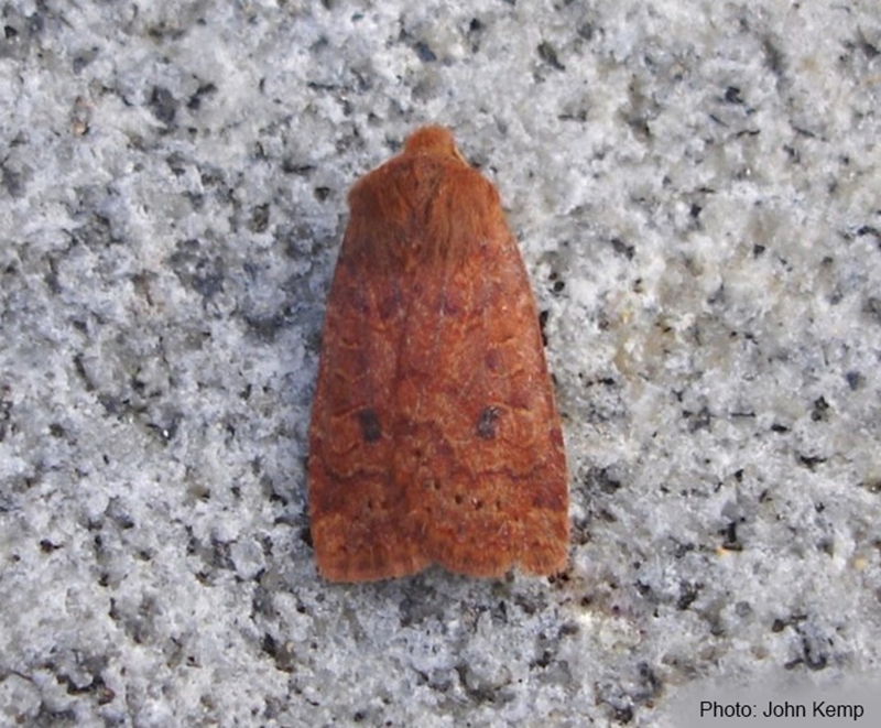 Just one record from South Uist in October 2009. A widespread mainland species flying in the autumn and overwintering, active on mild nights. The flight period is from September to May. The larval food-plants include hawthorns (Crataegus spp.), oaks (Quercus spp.), blackthorn (Prunus spinosa), downy birch (Betula pubescens) and docks (Rumex spp.).