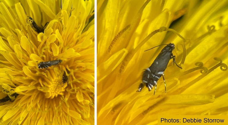 A small micro moth, 3-4 mm long, so easily overlooked. They are on the wing from May to July feeding gregariously on flowers, especially buttercups (Ranunculus). The larval foodplant is mainly cock's foot (Dactylis glomerata), where the tiny caterpillars feed on the seeds, later pupating in the stem. A common species in Britain but becomes sparse to absent in the north of Scotland.