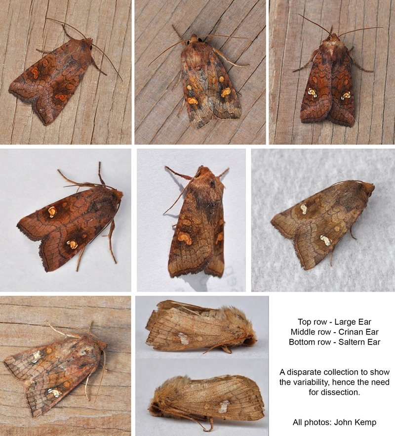 The Ear Moths are all very similar and can only be reliably identified by reference to the genitalia. Therefore, we have adopted [73.128A - Amphipoea sp. – Ear Moth agg.] in the checklist and on the website for recording purposes for all indeterminate specimens. When Billberg named the genus, he used the vernacular notation “Indet. Ear Moth” for all indeterminate species. However, we have adopted the modern notation of “agg.” denoting aggregate. A little confusing as ear moth (Amphipoea oculea) is an actual species. Leverton & Cubitt (2024) make the sensible suggestion that “ear moth” should be rename as “common ear” to lessen the confusion. It's a pity they didn't adopt it.
