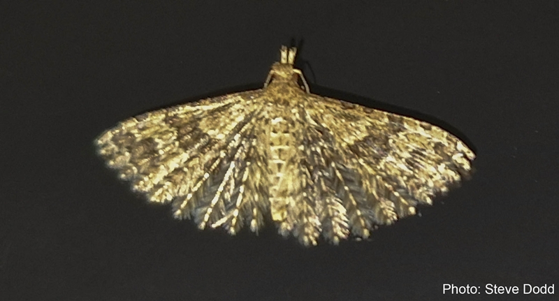 The original vernacular name of twenty-plume moth (still in common use) is a misnomer, as each wing is separated into 6 'plumes'. The specific epithet is more accurate, meaning 'six-fingered'. Alucitidae is a family of just this one species. It’s common throughout England, Wales and Northern Ireland, but more sporadic in Scotland. The Outer Hebrides is its north-western outpost and only found here in 2021. The moth is nocturnal and attracted to light. The larva feeds on the leaves and buds of honeysuckle (Lonicera).
