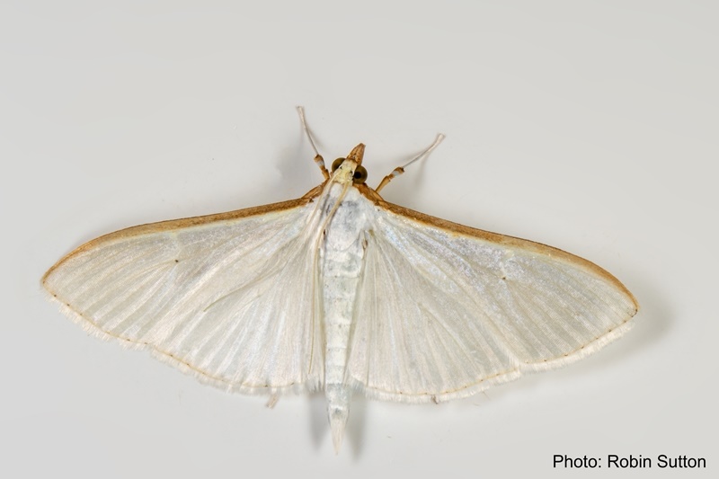 This moth, despite its relatively large size (fore wing length 13-15mm), is one of the micro-moths in the family Crambidae. Originally found around the Mediterranean region, the caterpillars are usually found on olives and it can be a serious pest in young olive plantations. The movement of olive plants around the world is thought to have contributed to its current, more or less, worldwide distribution.There can be two or three generations per year and adults from the later generations are known migrants and this will also have helped the spread of the species. The caterpillars can feed on other plants such as Jasmine, Privet and Forsythia.